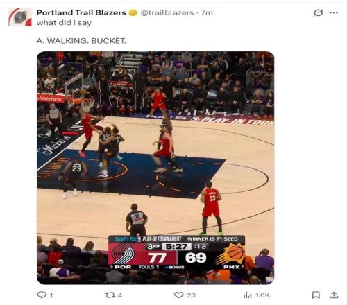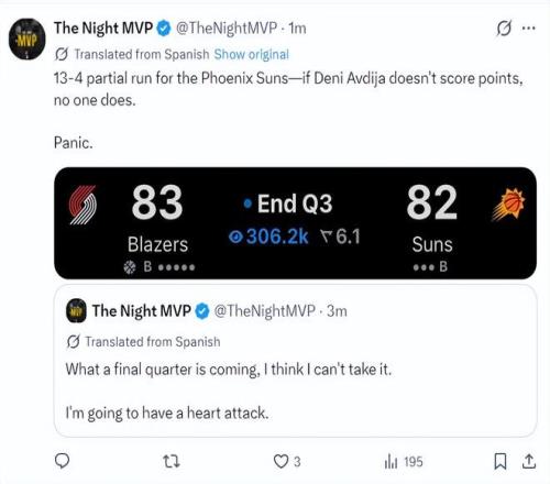 在第三节末尾太阳打出一波13-4的小高潮直接将分差缩小到1分,阿夫迪亚三节打完已经拿到27分9助攻4篮板2盖帽,开拓者的气势一下就没了。